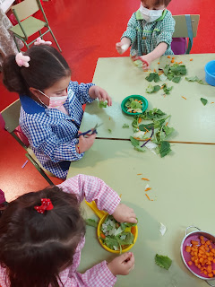 Preparamos las verduras de la sopa del lobo y la ovejita y también le ayudamos con el mantel.